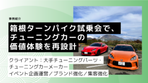 クライアント:大手チューニングパーツ・チューニングカーメーカー(東京都) 展示だけでは伝わりにくい商品の魅力を、体験型イベントで可視化。購入者ペルソナと商品の特長から試乗環境を設計し、見込み客獲得につなげた事例です。 ご […]