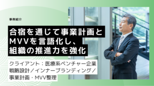 クライアント:医療系ベンチャー企業(東京都) ビジョンはあるが、優先順位や言語化が追いつかない。そんな経営者の構想を整理し、事業計画とミッション・ビジョン・バリューに落とし込んだ事例です。 ご相談背景・課題 創業まもない […]