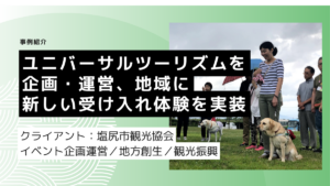 クライアント:塩尻市観光協会 観光協会として前例のなかったユニバーサルツーリズムに挑戦。企画から受け入れ調整、当日運営までを設計し、地域に新たな観光の可能性を示した事例です。 ご相談背景・課題 塩尻市観光協会が主体となっ […]